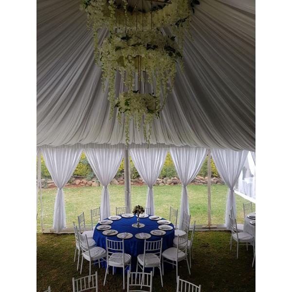 This tent use tension suspension. This tent requires less fitting and poles, installs in less time by useing frame tension design with tension cable rather than tedious pipe and pin conections. By simply add guttering, two or more tent can be connected to form larger size or unique shapes. Frame feature rustproof galvanized steel fittings integrated with marine-standard anodized aluminum pipe for reliable and super-strong frame systems.